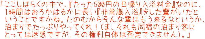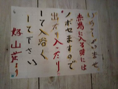 自分は日帰り(1回)入浴の場合、脱衣から着衣まで長くとも30分です。というか温泉ファンとはいえないほどに時には15分くらいで完結かなと。ぬるめの湯ではあっても1時間という入浴時間は十分すぎる長さです。これは栗駒駒の湯にもいえることですが(重要)、少なくとも「ほかのお客さんがいる場合はそこそこで上がりましょう!」。 |