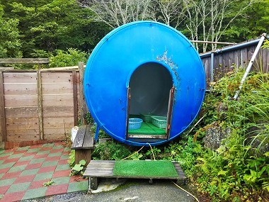 続いては駐車場を挟んで反対側にある露天風呂へ。前回も入浴したと思うんですが画像をアップしていないのは先客さんがいたからなのかな?うん、男湯の脱衣場ってこんな特殊なやつだった気がする(ミルクタンク?)。 |