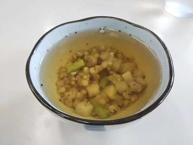 先に出されたのが蕎麦の実入りスープ。醤油だしベースですが、コショウが利いていてこれはこれでありかなという感じ。蕎麦の実だけでなくネギを入れているのは具のアクセントとしてポイントが高いと思います。 |