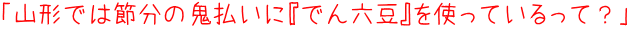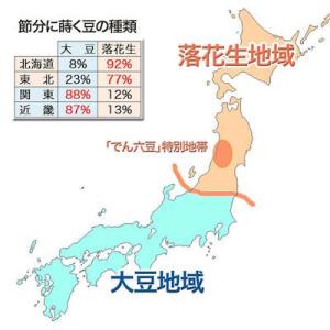 この画像における分類およびオフィシャルの動画は恣意または作為的なものかも知れません。でも少なくとも山形市に本社を置く(株)でん六は、節分豆まきにでん六豆を撒いてもらうことに積極的な営業姿勢のようです(笑)。しかもそのために小袋(撒いてもそのあと回収して食べられるように)まで用意されているのだとか?(でもいっぽうで節分用豆まきページでは普通の大豆ラインアップが紹介されているんですがね。全国用?)。 |