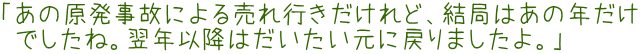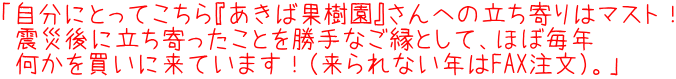 というお言葉でした。これを聞いた時には「え?『福島の桃の風評被害売れ行きダウン&単価下落』という情報自体がデマだったのか?」と思ってちょっとびっくりしましたが、よくよく考えればこちらの果樹園は小規模?ということもあってもともと県外への出荷を行っていなかったようなのです。ネット通販もやっておらず(直接の注文はFAXで)、つまりは「地産地消、地元の方相手の商売」だったことが幸いして長き風評被害に苦しまされることもなかったということのようです。なるほど‥(いろいろあるんだなと)。 |