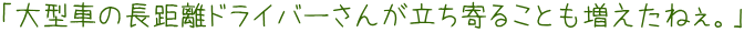 とおっしゃっていました。多くの直売所が「駐車場スペースは広いが間口はそれほどでもない」なか(それでもバスとかは切り返せば入れますが)、こちらの直売所は「幅広スペースとはいえ奥行きは全然なかったところに、道路拡幅の関係で逆に前方のスペースが広がった」ことで、何とトレーラーでもそのままスルーイン&アウトできてしまうという僥倖モードとなったようなのであります。ゆえにトラックの皆さんが「お、ここは止めやすいから寄っていくか」という流れになっているようなのです(ばんざーい!)。 |