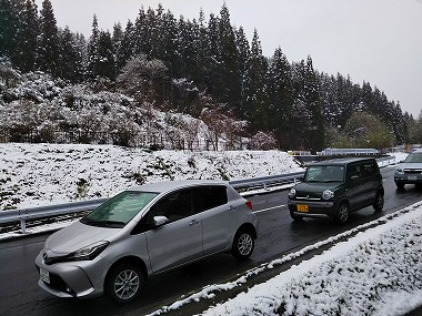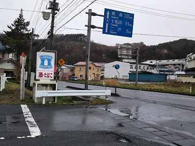 ただここから下っていくと雪も止んできてとりあえず安心です。金田一温泉を越えた先の道の駅で一休みして、さらに進んだあたりのコンビニでトイレ休憩です。 |