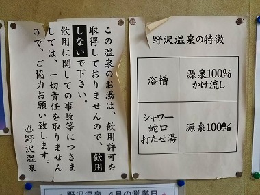 というわけでGW最初の「入浴」です。先客さんが3名おられたのでもちろん湯画像はありません。皆さん何も話さずある人は目をつぶり、またある人は上方の一点を見つめながらただひたすら湯に浸かるばかり、お湯は「やわらかい」としかいいようがないややぬるめ湯で、「そりゃ確かに『恍惚の人』チックになるよなぁ」と妙に納得するばかり。お湯のイメージとしては秋田県湯沢市の湯の沢温泉日勝館にかなり近いかなと思います。まったりしちゃうんですよ、ハイ。 |
