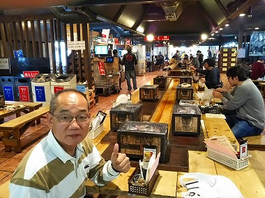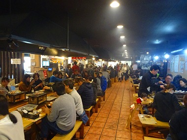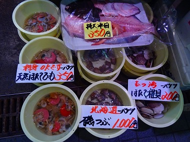 ここは「市場内のお店で買ってきたものを焼いて食べられる」エリアでありまして、その手順については「受付で席確保(炭代350円)」-「お店で焼くモノを買ってくる」-「当然ですが焼いて食べる」-「片付けはセルフで」(番号札を受付に返却)という流れです。上画像はとりあえず席を確保した段階でのもの、さて、買いに行きますか! |