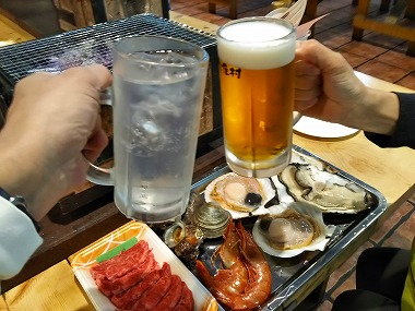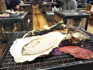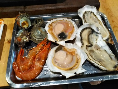 左上画像のように単品で頼むのも問題なくOKのようなのですが、店によっては右上画像のように「焼くことを前提にしたサンプル品」を並べているところもあります。ちなみに右上画像の海鮮品を購入したのですが、サンプルをそのまま出すのではなく、注文を入れると牡蠣もホタテも全て新しいものをさばいて提供してもらいました。良心的。あ、お肉もしっかり買ってきましたよ。 |