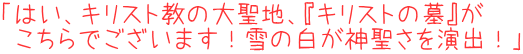 以前訪問した時と特に変わりはありませんでしたが、やっぱり夏と冬とでは趣が違いますね(冬のほうがいい感じ)。もちろんエルサレム市とはいい感じの関係であることを示すヘブライ語の記載も健在でした。 |