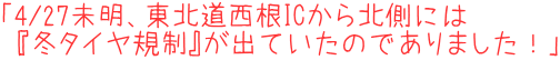 いや普段はGW前のタイヤ履き替えなどしていなかったんですよ。ただ今シーズンは3月に最初の車検というわけで「ではついでに」とタイヤを積み込んでの車検をお願いしちゃったわけですんで大失敗。3月末もそれで失敗したし、まさかこのGWでもこれで北上を阻まれるとは!というわけで眠くなったこともあるし‥ |