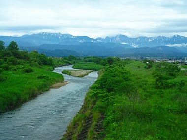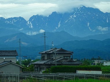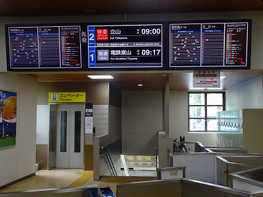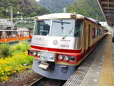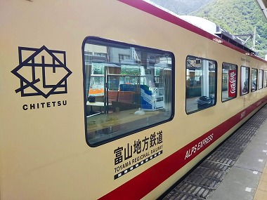 宇奈月駅から立山駅って、ぐるっと山裾を巻いていくのでそこそこ時間がかかり、また通常は電車の乗り換えも必要ですが、有り難いことに観光向けに直通の特急「アルペン号」が週末中心に1本だけ運行されています(宇奈月から室堂直行バスの運行もあるようですが、それじゃあんまりに風情がないのでね)。 |