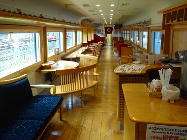 さて昭和45(1970)年製造のこの車両は今年で「49才」の車齢であり、地鉄でその大幅な改造を受けてからももう23年になるわけですが、メンテナンスが丁寧に行われているのでしょう、車両外観にガタピシ感もありませんし車内も綺麗(2011年にアルペン号用の改装を行ったそうです)。 |