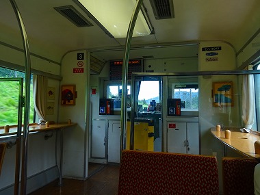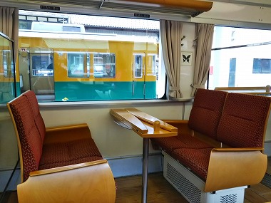 われわれがキープしたのは左上画像のテーブル付きの席。「コンパートメントシート」というようで、車両の端っこにしか設置されていない、いわば特別席です。まぁそれだけ空いていたわけですが(うーむ微妙)。 |