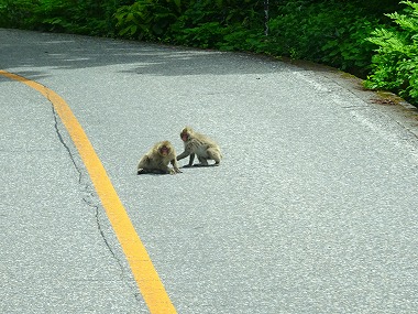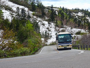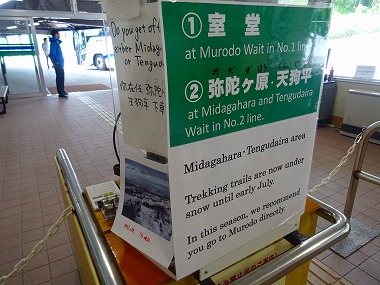 さて美女平駅でバスに乗り換えるわけですが、室堂直行便と各駅停車便とでバスを分けているようです。室堂便にはどんどんお客が乗り込んでいきますが(そのほかに団体ツアーバスも出発していきます)、2番線たるわれわれの列には7-8人のみ。なるほど、途中バス停での乗車予約はそういうことになっているわけですね。 |