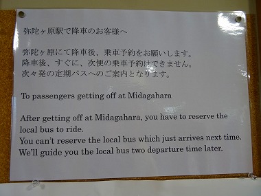 さてお昼ごはんを終えてバス停留所へと向かいます。コインロッカーから荷物を出して‥と、知らなかったんですが美女平からの乗車時に「ミダ」(弥陀ヶ原)行きのタグというか養生テープが貼られていたんですね(もちろんこの後すぐに剥がされました)・。 |