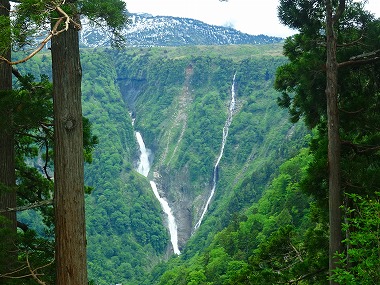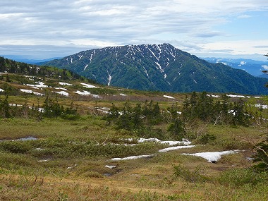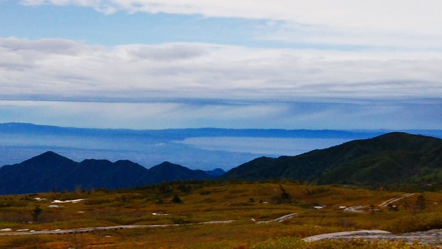 大日岳~奥大日岳の稜線もガスのベールはすっかりどこへやら、しかも目を下界に移せば、富山平野と富山湾までもがはっきりと見えています(あとでバス停の職員さんに聞いたところ、「こんな天気の時に富山湾がよく見えるのは天候悪化の前兆」なのだそうです)。 |