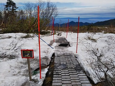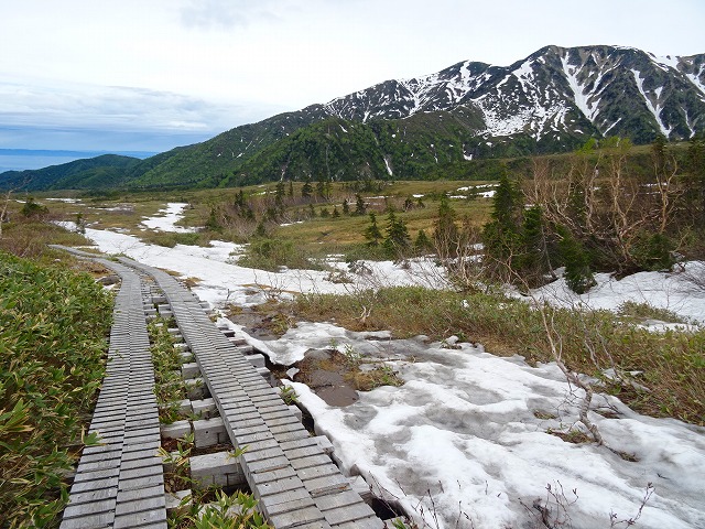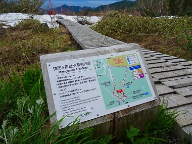 うーむ、いきなり木道が雪に埋もれています。こ、これは?と思いましたが、実は雪が残っているのはごく一部で、多くの場所では普通に木道を歩けました。この日は土曜日でしたが、まだ花の時期には早いのともともと雨予報だったのとで人はほとんどおらず、よって「ほぼ独占!弥陀ヶ原!」なのでありました。 |