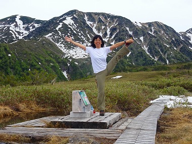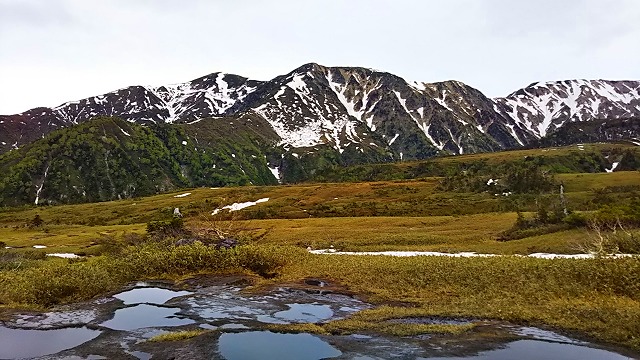 ちなみに手前の池塘群は通称「餓鬼の田」と呼ばれ、立山信仰の中では「餓鬼となった亡者が餓えをしのぐためにこの池塘で田植えをした(が結局無駄手間となり永遠の飢餓に苦しむ)場所」とされています。しかしなぜか環境省が整備した広場は「ガキの広場」とカタカナ書きで、これではその由来を知ることはできません(まるで「ちびっこ広場」の言葉遣いを悪くしたような感じです)。 |