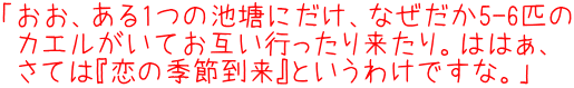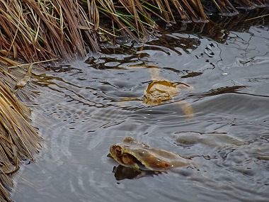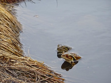 おそらくは「アズマヒキガエル」という種ですが、求愛行動がなかなかに(彼らなりに)忙しいようで、メスを追いかけるオスが突然追うのをやめたと思ったら今度は別のメスにすり寄っていったりして(ナンパ行動?)、普段はなかなか見ることのできない「カエル世界のリアル」を観察できましたとさ(笑)。 |