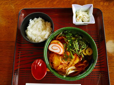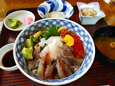 雲海丼定食とかき揚げうどん。雲海丼は生のシロエビ・ホタルイカものっていてウマウマ、うどんのかき揚げにもシロエビが入っていて新鮮さ&お味もよしよしです。毎日市場からここまで上げているんでしょうかね。 |