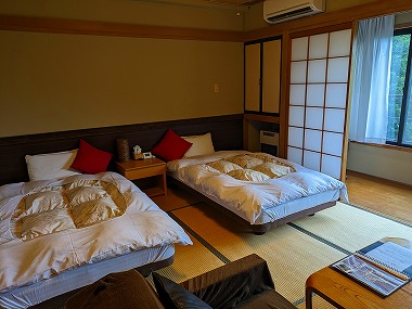 薬師館の部屋数は10部屋。実際にはもう少し部屋はありそうな気もしましたし、奥には旧施設(使ってなさそう)もありましたが、旧施設はともかくとしても「現行スタッフで回せる室数で」という運用なのではないかと思われます。お部屋はご覧のとおり畳にベッドがデフォルトのようで、なるほどこれは悪くないです(畳敷きのままなのは経費節減のためなのでしょうが)。 |