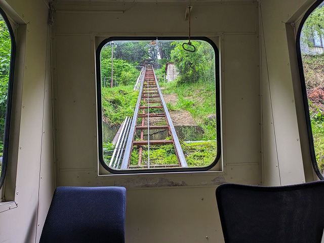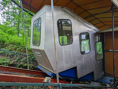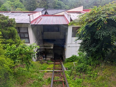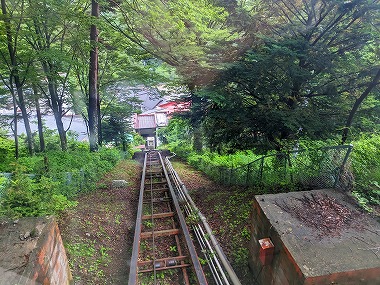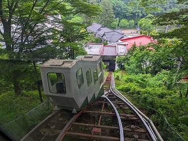 なるほど、入浴料\1500にはこのケーブルカー利用料金も含まれているわけで、この鉄道路線の維持管理費を考えれば仕方ない額かも知れません。でもわれわれは姉妹館の宿泊ということで無料!この日休館である常盤館の宿泊者は当然ゼロで、駐車場もほんの数台しか駐まっていなかったし、これは期待できるかも? |