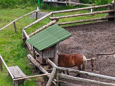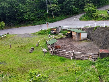というわけで薬師館に戻ってきました。ん?一段下の広場では馬が飼われているのですね。しかし‥何のために飼っているのだろう?ホーストレッキングでもできるのかな?(未確認。「エサやりはできる」とはどこかで見ましたが)。 |