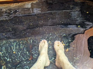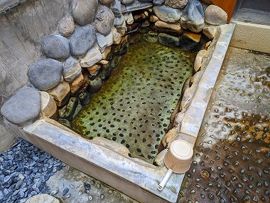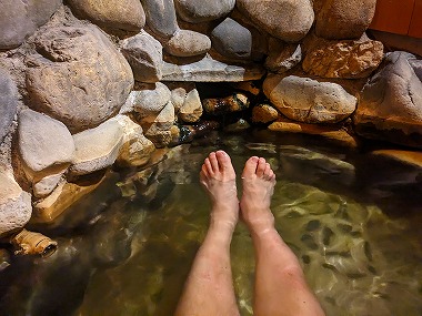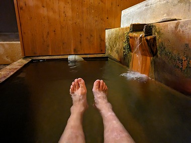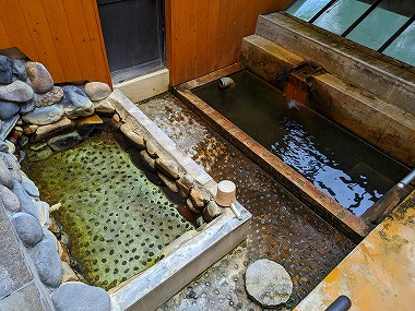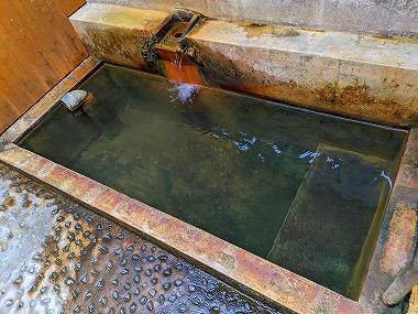 苦行です。でも浴後は不思議とポカポカ感が続くのが不思議なところですね。ちなみに上段の加温湯も含めて塩素臭は皆無でした。加温浴槽内に吸い込み口はなく、壁側の湯尻口からオーバーフローしていましたから「加温かけ流し」だと思われます。下段の湯に至ってはいうまでもなくかけ流しそのもの(笑)。 |