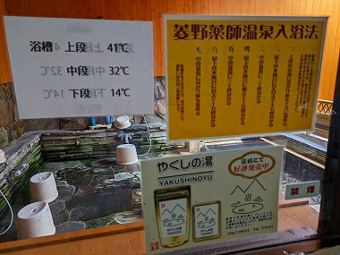 かなりびっくりしました。お勧め入浴法も記されていて、「高温湯-低温源泉に足首まで15秒-中温湯に30秒-源泉に腰まで15秒-中温湯に30秒-源泉に肩まで15秒-中温湯に浸かって仕上げ」ということのようです。歴史ある菱野温泉(薬師館)なので、この入浴法も歴史の中で育まれてきたものなのでしょう。 |