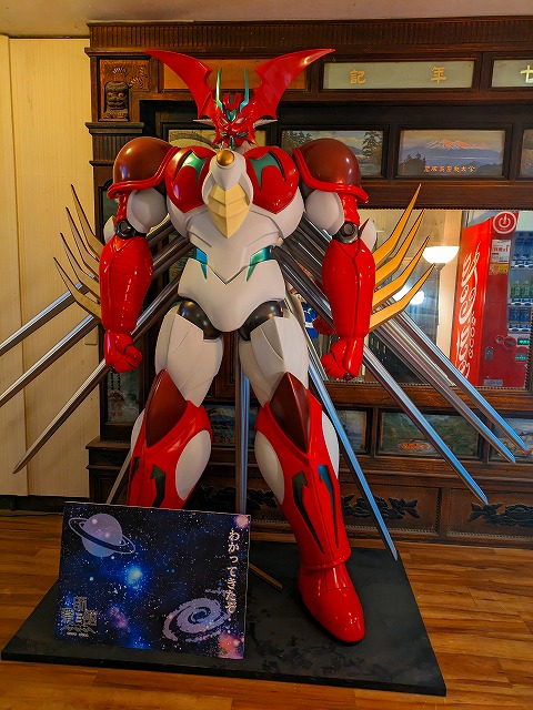 ロビー近くには歴史を感じさせる調度品が置かれていました。かなりの年代物のようで、おそらくは旧館(現在の建物の裏側にある)で使われていたものを移設してきたのでしょう。しかし、なぜかその前に石灯籠を置くというなかなか微妙なセンスもうかがわれます(笑)。 |