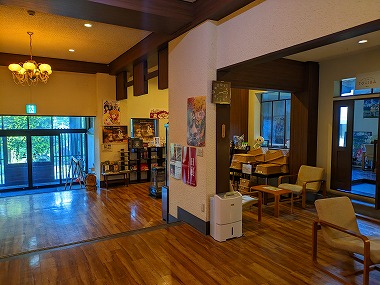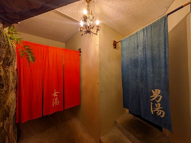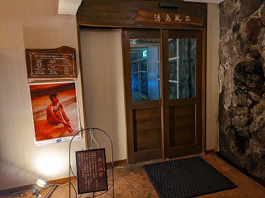 さすがに腹パンというわけでもないので、しばらく部屋で休んだあとはまたお風呂へ。宿泊棟からロビー脇の温泉入り口に至るまでの区間も半地下的な造りで、やや湿気が多いのと(水場もこの途中にあり)、そんな造りゆえの湿っぽいにおいもないではないですが、これはこれでこのお宿の味わいとして自分としては好きでしたよ(要所要所に扉がありました)。 |