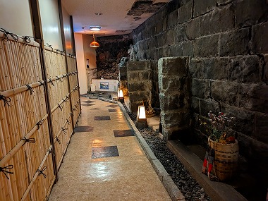 実は本当に下調べが甘く、温泉棟に行くのにこんなトンネルを通っていくとは微塵も知りませんでした(忘れていたともいう)。内部はひんやりとしていてうっすら寒いほどです。しかし驚きはまだ続きます。 |