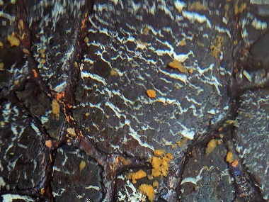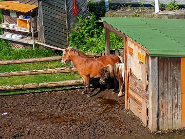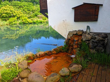 というわけで朝ごはん前に表に出てみました。湯小屋の正面は池になっているのですが、建物脇からは源泉の余り湯(浴槽からのオーバーフローじゃないと思われます)が出ていました。この濃いサビ色はさすが鉄泉ですね(単純炭酸鉄泉)。 |
