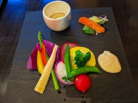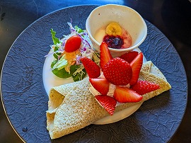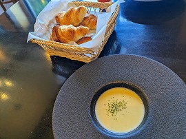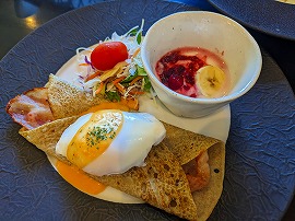 さて朝ご飯は3種からの選択です(チェックイン時に選択したかと)。蕎麦のガレット2種類(ベーコン&卵、またはフルーツ&カスタードクリーム)、または定番の和定食からの選択です。和定食はいつでもどこででもという感じなので、当然われわれはガレット2種を選択していました。ポタージュスープと自家製パンも付いています。自分はガレットってまずほとんど食べてこなかったのですが、こんな感じなのですね。小洒落ていますしたまにはいいかな(でも頼むならやっぱりベーコン&卵のほうかなと)。 |