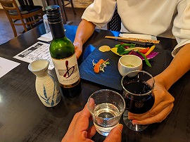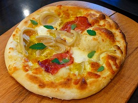 前菜は地元野菜のスティックと自家製ごま豆腐、それにカルパッチョ。というわけでまずはワインと日本酒とで乾杯。と、2品目にはピザが出てくるというなかなかマーベラスな展開です。これはやはり赤ワインが正解だったか?いやいや、本日のお品書きを見てからの飲み物注文でしたから問題ありません。 |