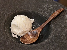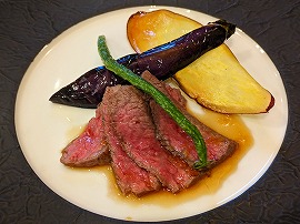 続いてテーブルに運ばれたのはは信州牛のステーキ(りんごソース添え)です。テーブル上で自分で焼くのではなく、調理済みのものがちゃんとプレートに載せられて提供されます。セルフ焼きは省力化や「お客がアツアツを食べられる」という点でのメリットはあるのかもしれませんが、素人であるがゆえに焼きすぎたりしてベストの状態で味わえていないような気もします。やっぱりプロの手による料理のほうがうれしいと思うのです。 |