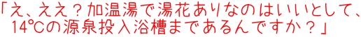 そして、まさに源泉かけ流しの下段浴槽。きっちり14度でした。この日は比較的ひんやりしている日だったこともあり、体感的にはかなーり冷たい!(実は水風呂が苦手なTakema)。ただ中段の湯が上記の理由からどうも落ち着かなかったので、結果としては中段はあまり使わず、上段と下段との往復が多かったですが。そして‥ |