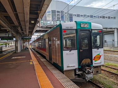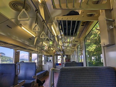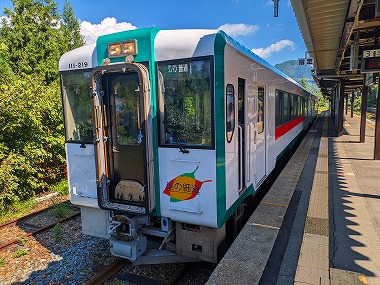 そして鳴子御殿湯駅から新庄行きに乗車しました。車内は空いており、鳴子温泉駅でさらにガラガラになりました。鳴子温泉-新庄間は一部で廃止も取り沙汰される不採算路線だということですが、これでは確かに‥。 |