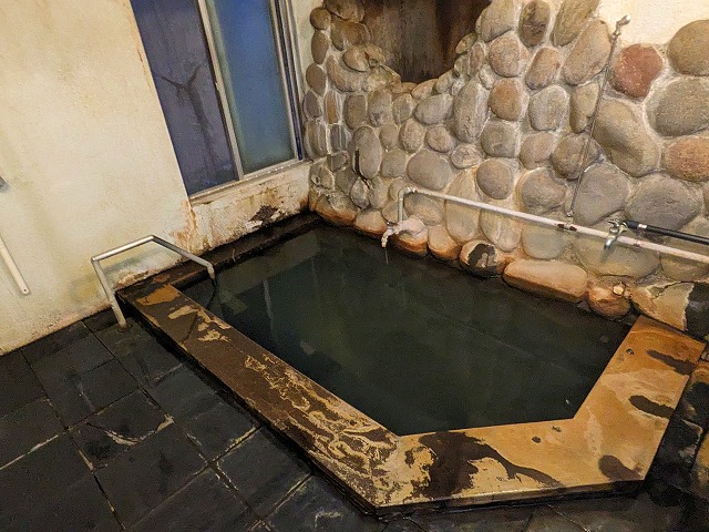 というわけでくすり湯です。「肩まで浸かるのは1分以内にしておけ」とか「湯のぼせ客多数」とか、何やらおどろおどろしい話は聞いていましたが、とにかく温まる湯なのは確かなようです。となると、このクソ暑い日に熱気で暑い浴室で熱い湯にはそう長く浸かりたくもありません(笑)。「じゃあ入浴しなければいいじゃん」とのツッコミはなしね(苦笑)。 |