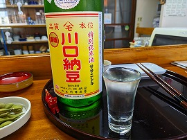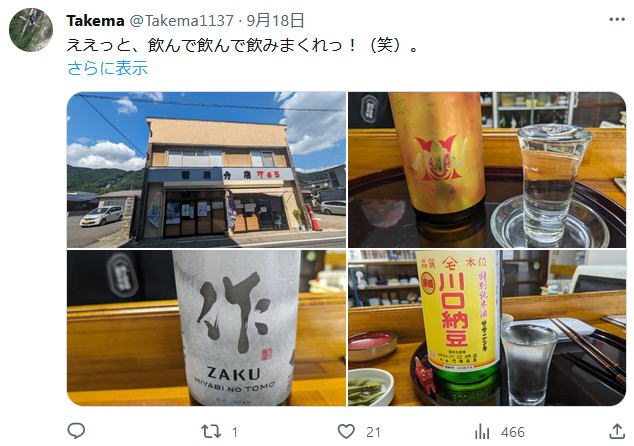 上画像のグラスには全て異なる銘柄のお酒が入っていますからね。このあとはまだ列車に乗りバスにも乗るのに大丈夫なんでしょうか?(苦笑)。ハイ、大丈夫でした。この前夜には飯坂の居酒屋「源」のマスターに「お客さん、お酒強いね」と言わしめたTakemaですし!(その負の勲章としてのγ-GTP云々)。 |