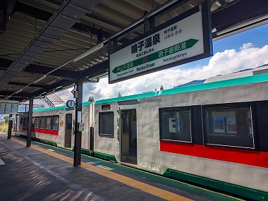 というわけで飯坂温泉駅に到着。ちなみにSuicaは使えませんので紙の切符を現金購入です。面倒な一手間ではありますが、逆にこのご時世にあっては味わい深い儀式であるともいえます。拙サイトをご覧の方々は旅行好きの比率が高いのではないかと思いますが、券売機に硬貨を入れて切符を買ったのはいつ以来ですか?(特急券や指定席券とセットで買うのじゃなくてあくまで乗車券だけね)。 |