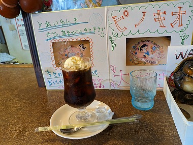 入ってみると、比較的小さなお店で空席はカウンターしかありませんでした。というわけでここで久々の水分(非アルコール)を補給!注文したのはコーヒーフロートでしたが、席に付いた直後に供されたお冷やグラスの水がかなり減っているところに「Takemaの本能が何を求めていたか」がわかります(笑)。 |