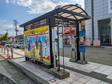 さて再び新庄駅前に戻ってきました。バス停の看板を見ると「民営から公営へ」という地域の現実がよくわかります。自分としては「へぇ、羽根沢温泉へも新庄からバスが出ているんだ」ということへの驚きが大きかったですが(未来への野望)。 |