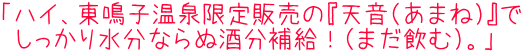 で、このバス待合所にて天音を一気に飲み干しました。この日はよく飲んだなぁというわけで、このあとは村営バスにて肘折温泉へと向かいます。でもまだちょっと飲むんだけれどね(大苦笑)。 |