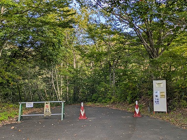 手前の看板には「休業」という貼り紙が。これ、8月の開放日が終了したときにおしんこどんが貼りつけたものですが(その時の様子はこちら)、今回はあえて外さず、予約を下さった方には「『休業』とありますがそのまま進んで下さい。その先にはA型ゲートと三角コーンとで道路が塞いでありますが、コーンを移動して(通過後はコーンを元の位置に戻して)下さい」と伝えてありました。無許可でコーンをずらして侵入する人はいないと思うので。 |