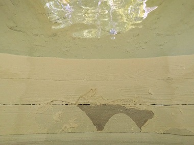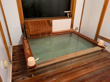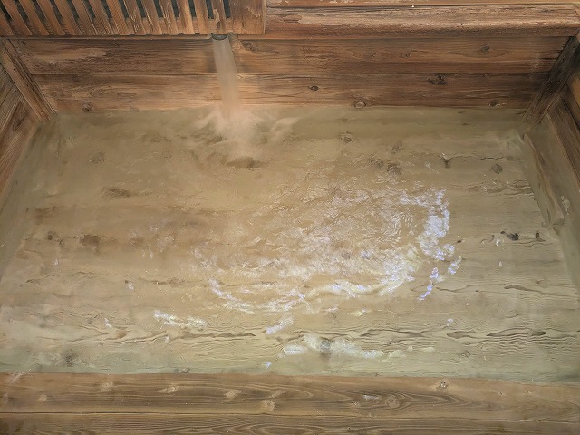 そうなのです。湯の中で長く舞いやすい「細かく軽い白湯花」は最初のオーバーフローとともに流れ出してしまったようで、浴槽内は案外に透明な湯と大きく重たげな白湯花(オーバーフローしにくい)が残されている感じでありました。かき回せばそこそこの湯花が舞う状況ではありますが、こりゃ「にごり湯」とはいいにくいかもなぁ。 |