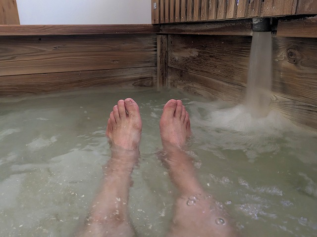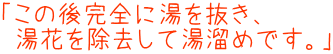 ご存じの方はほぼおられないと思いますが、透明湯に見える駒の湯の源泉は空気に触れると湯花の析出が顕著になり、そのため1晩でもそこそこ湯花が舞う(湯底に沈殿する)ようになってしまいます。 |