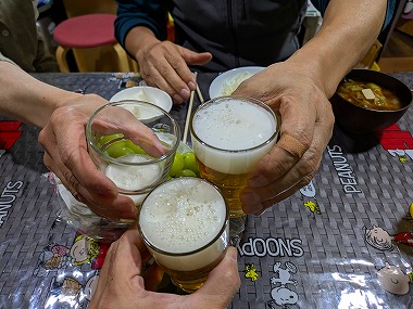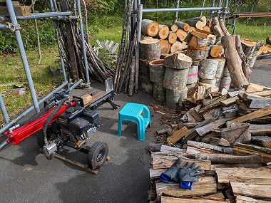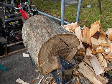 こんなに太い丸太でもしっかり割れてしまうのですから、今の薪割り機は優秀です(エンジン式)。日暮れ前に作業を終えて3人で乾杯!というわけで初日終了です。自分で言うのも何ですが、この日は深夜運転の寝不足にもかかわらずそこそこ頑張ったぞ。 |
