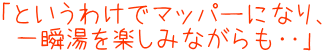 とりあえずこいつらを割ってやっつけるわけですが、いかんせんTakemaの腰はまだ全然万全でもないので湯守も気を遣って下さいました(年上なのに‥)。でもひと月前に比べればだいぶマシにはなってきたんですが。 |