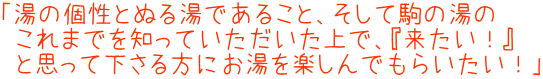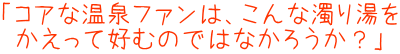 湯守としては「駒の湯の新鮮湯を楽しんでほしい」という思いから透明湯にこだわりを持って維持管理をなさってきたはずですが、温泉ファンの端くれたるTakemaとしてはちょっと別の思いもありました。それは‥ |