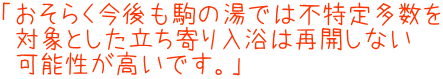 その理由として第一に「いつ来るかわからない立ち寄りのお客さんを待つことにより自分たちの仕事や所用に時間が割けなくなる」こと(薪作りや地区の仕事など)、そしていざやってきたお客さんにしても「駒の湯の諸事情を知らない方々の対応に気疲れすること」(ぬるい!とかシャワーがない!とか)もあり、湯守も喜寿を迎えた現状ではかつてのような営業スタイルが難しいということのようです。 |