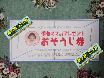 突然こんなものが届いた。そう、TVでコマーシャルをしているNTTの、慎吾ママをして「なんでNTTが?」「わからない」と言わしめた、あのよくわからない「おそうじ券」そのものだ。どうも当たってしまったみたいなのだ。彼のあのキャラクターそのものは個人的に「うむむ」と思ってしまう部分があるけれど、そんな個人的な感想は一切ともかくとして、当たりは当たりのようだ。